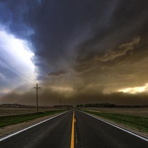 A dust storm, kicked up by a strong rear-flank-downdraft, sweeps across rural eastern Nebraska in April 2025.