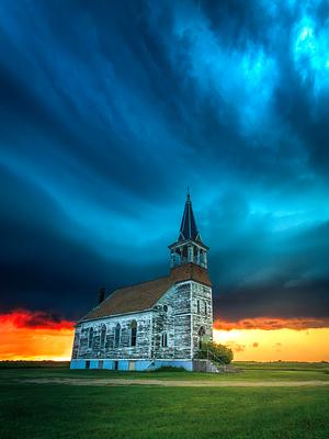Thunderstorms at sunset looming over Bethel Church near Harvey, North Dakota, June 2025