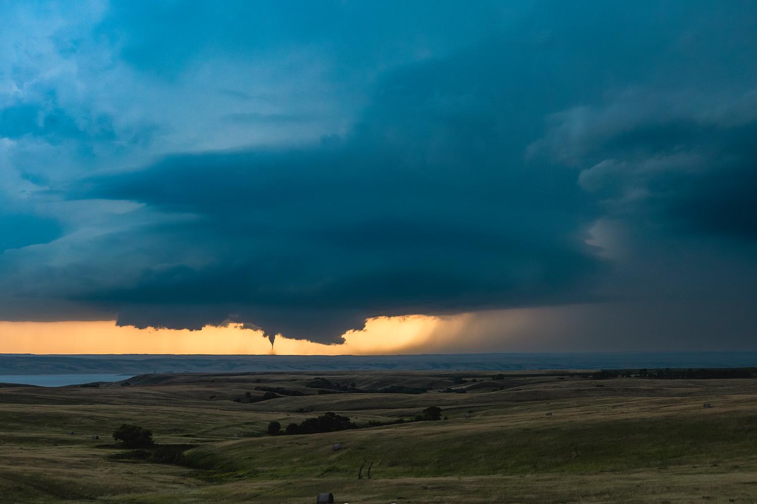 A distant supercell thunderstorm and tornado near the intersection of the Missouri River and the North/South Dakota border -- in North Dakota near Fort Yates. August 28th, 2024.